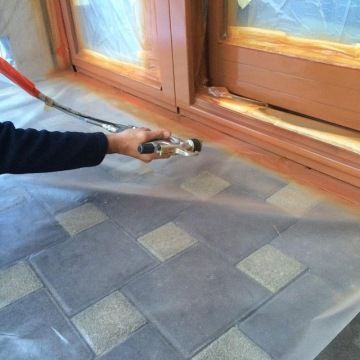 - Ve finální fázi použijeme vodou ředitelnou silnovrstvou lazuru (Induline LW-700). Vzhledem k tomu, že budeme pro finální aplikaci nátěru používat vysokotlakou stříkací pistoli, musíme pečlivě zakrýt veškeré části, jichž se aplikace netýká. Aplikaci barvy stříkáním jsme zvolili proto, že je tento způsob efektivnější.